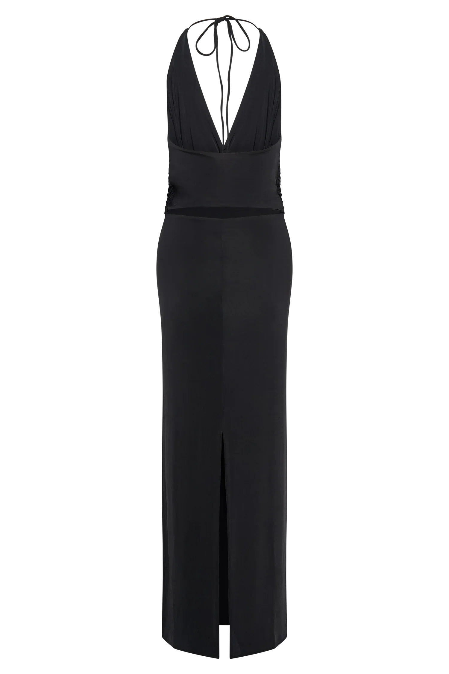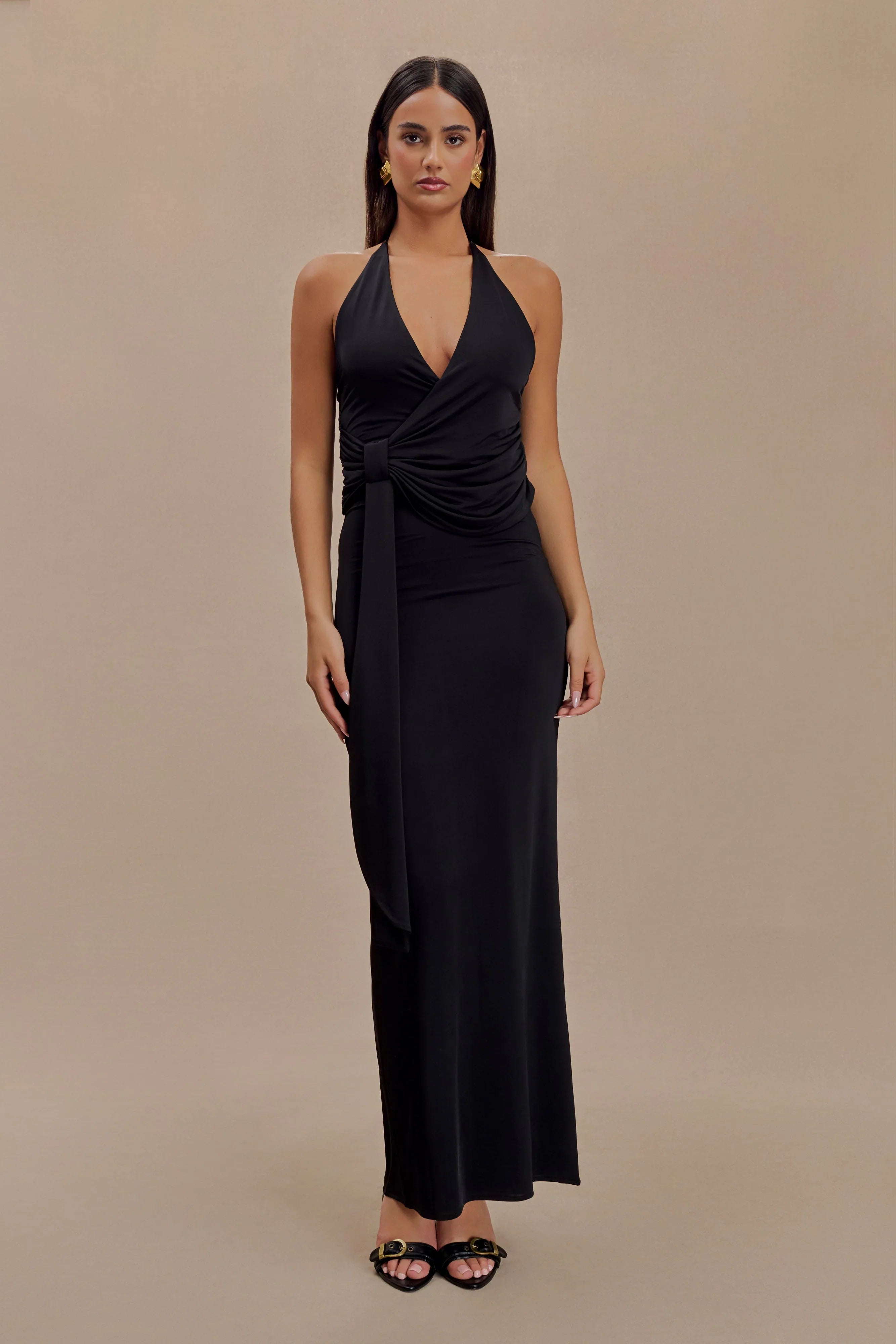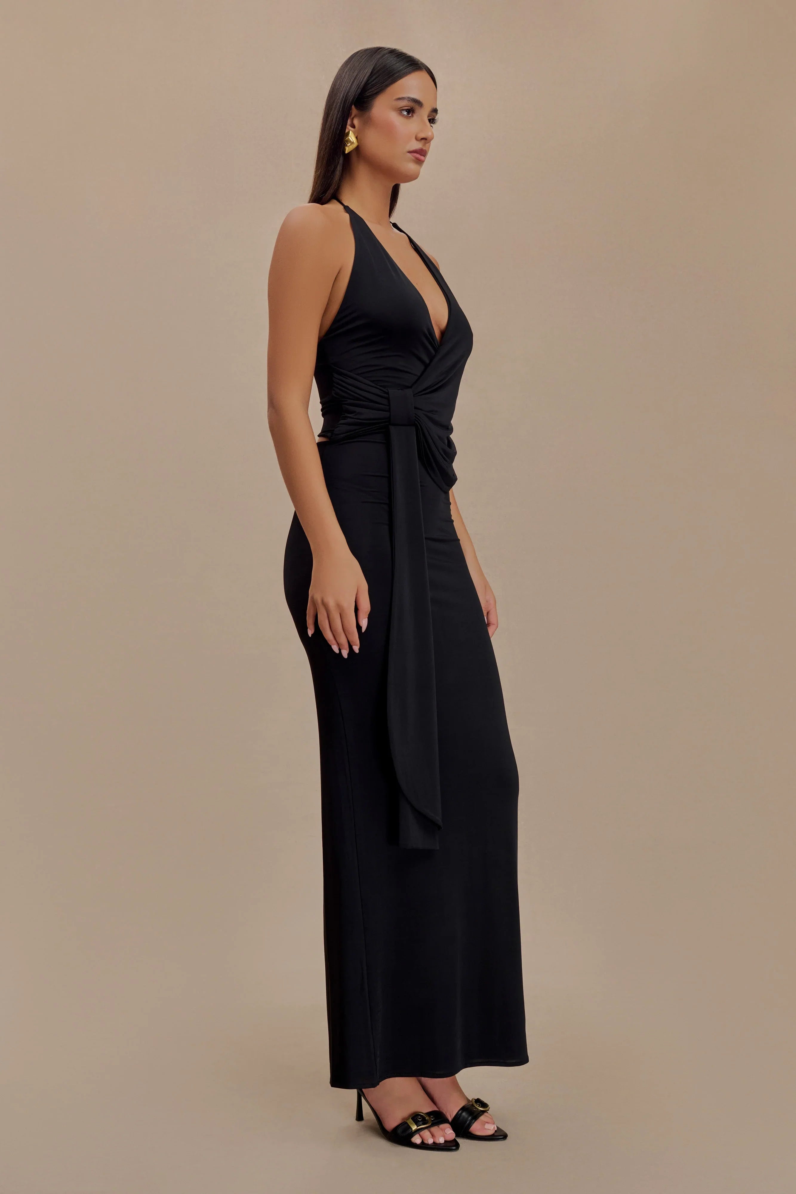 The TYLA Draped Slinky Halter Maxi Dress exudes modern sophistication with its halter neckline and elegant V-front. The draped bodice and tie detail at the hip create a flattering, feminine silhouette, while the open lower back and subtle back split add an irresistible touch. Made from stretch fabric for a comfortable yet sleek fit, this dress promises graceful movement and effortless style for your most memorable moments.